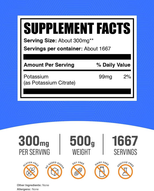 Potassium Citrate Powder Supplement - 99mg Potassium, Gluten Free, 300mg per Serving, 500g (1.1 lbs) - BulkSupplements
