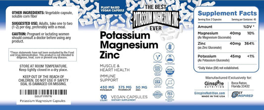 High Absorption Vegan Magnesium Potassium Zinc Supplement - 90 Capsules for Vascular Health, Leg Cramps & Sleep - GINSPIRE NUTRITION Supplement