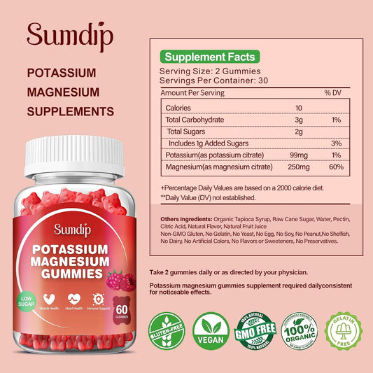 Raspberry Potassium Magnesium Gummies for Leg Cramps and Muscle Relaxation, High Absorption, 60 Gummies