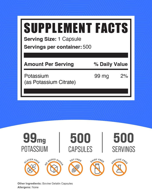 BulkSupplements.com Potassium Citrate Capsules - 99mg Potassium Supplement - 500 Capsules, Pack of 1