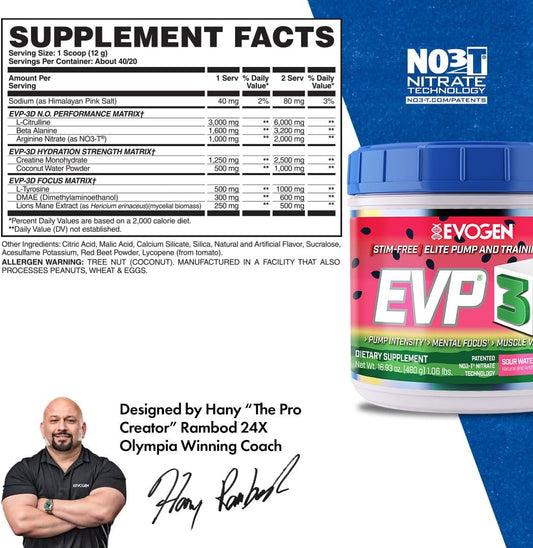 Evogen EVP 3D Sour Watermelon Pre Workout Powder - Non Stim with Beta Alanine & Creatine for Energy & Pump - 40 Servings