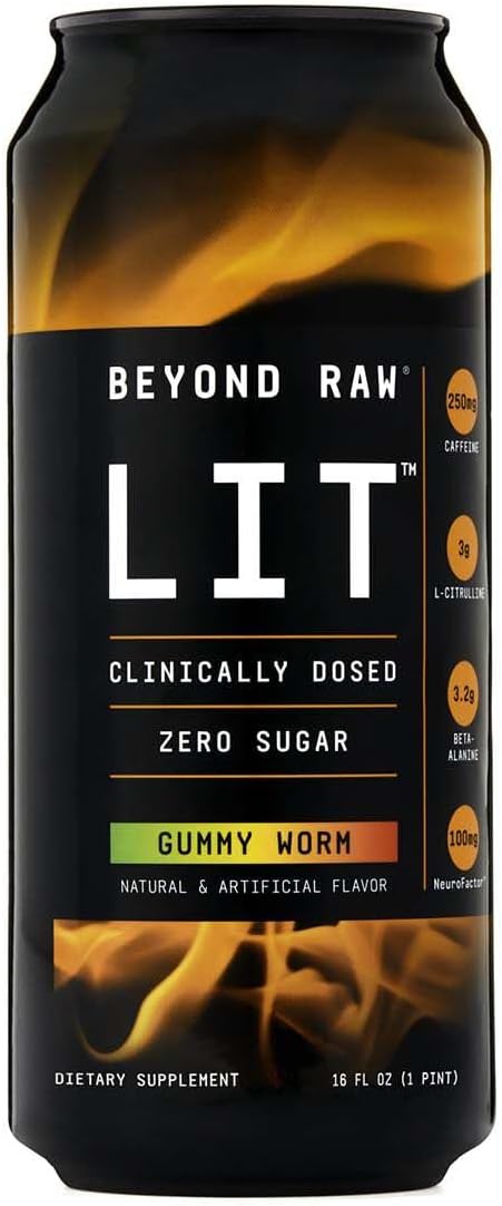 Beyond Raw LIT On The Go Ready to Drink Cans with Caffeine and Amino Acids - Gummy Worm Flavor 12 Pack