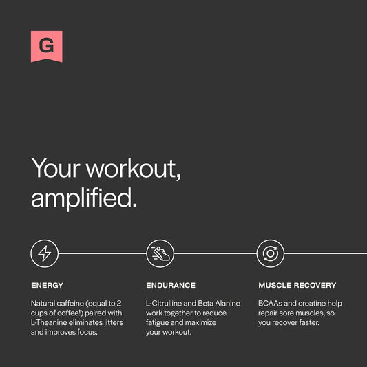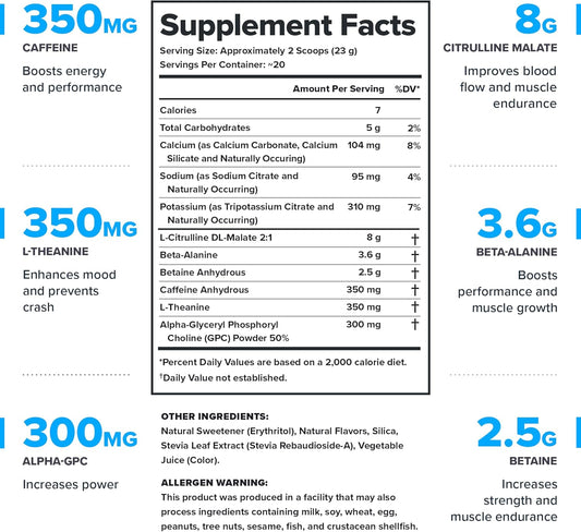Energizing Pre Workout Powder with L Theanine, L Citrulline, Beta Alanine, BCAA's, 14 Servings, Strawberry Lemonade Flavor