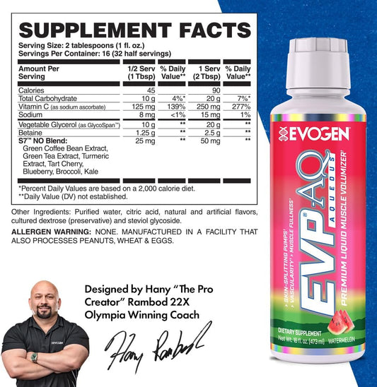 Evogen EVP AQ Liquid Glycerol Muscle Volumizer Pre Workout - Watermelon Flavor - 16 fl oz - Enhances Pumps, Vascularity, & Hydration - Premium Formula for Men & Women
