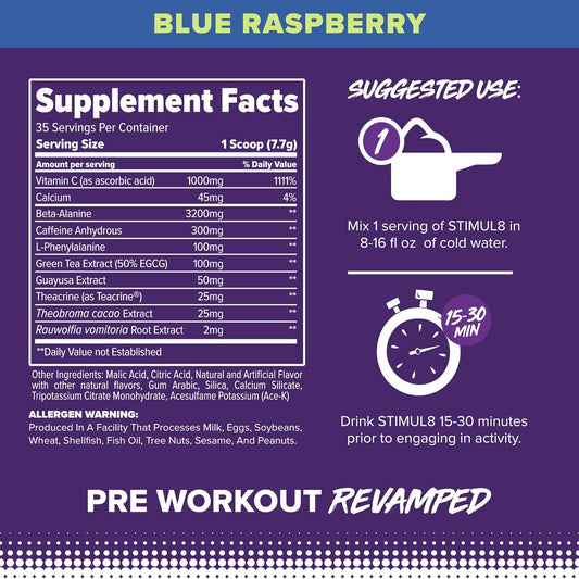 FINAFLEX STIMUL8 Original Blue Raspberry Pre-Workout - Boost Energy, Strength, and Endurance with Caffeine, Beta-Alanine, and Vitamin C - 35 Servings for Men and Women