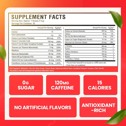 Sugar-Free Watermelon Morning Buzz Energy Drink Powder with Antioxidants - 30 Servings, 8 Ounces - Energy Boost and Sports Nutrition Supplement