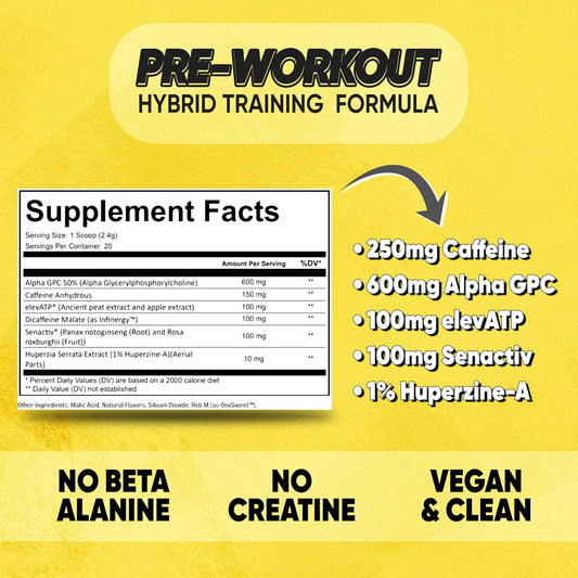 Hybrid Pre Workout Powder Supplement with 250mg Caffeine and Alpha GPC for Energy, Focus, and Endurance - 20 Servings for Men & Women