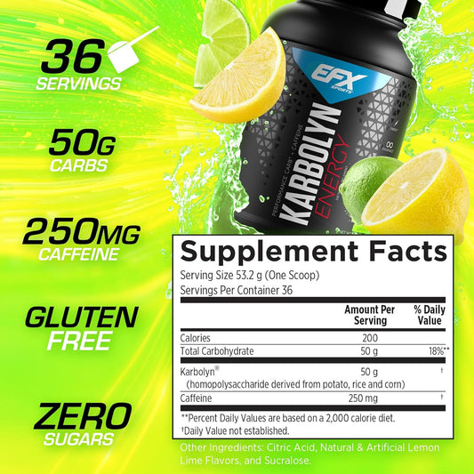 EFX Sports Karbolyn Energy Powder with Caffeine - Sugar Free Carb Load & Energize Supplement - Lemon Lime Flavor - 36 Servings