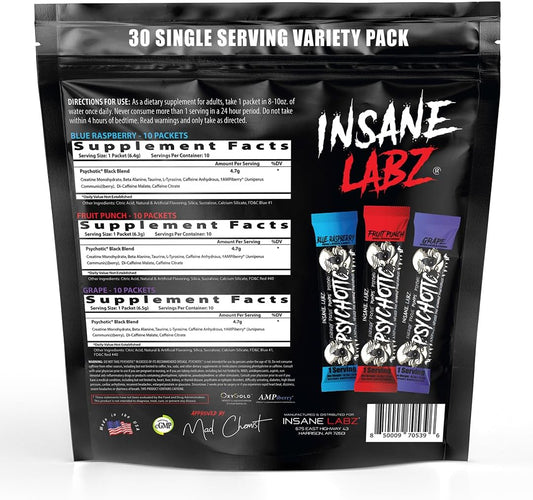Insane Labz Psychotic Black Edition Pre Workout Powder - Mid Stimulant Formula with Creatine Beta Alanine Taurine - AMPiberry Fueled - 30 Servings