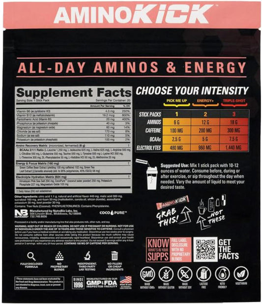 NutraBio Amino Kick Performance Formula Raspberry Lemonade 20 Servings - 6g Amino Acids for Energy, Hydration, Recovery - Muscle Building Support