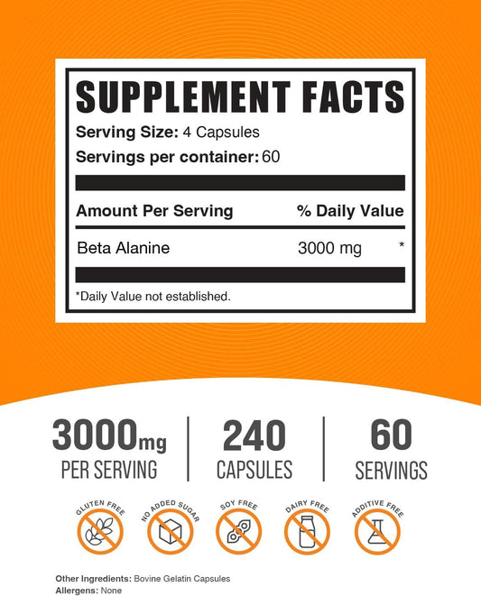 Beta Alanine 3000mg Capsules - Gluten Free Supplement, 240 Capsules - 4 Capsules per Serving