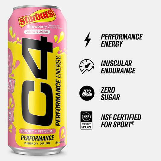 STARBURST Strawberry Cellucor C4 Performance Energy Drink - 200mg Caffeine, Zero Sugar, 12 Pack