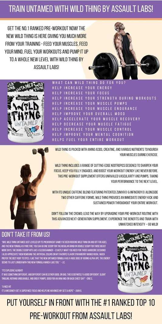 Assault Labs Wild Thing Pre Workout Powder - Di-Citrulline Malate, Beta Alanine, L-Glutamine, Caffeine Anhydrous, L-Tyrosine, Huperzine, Cocoa Extract - Energy, Muscle Health, Focus - Rocket Pop Flavor