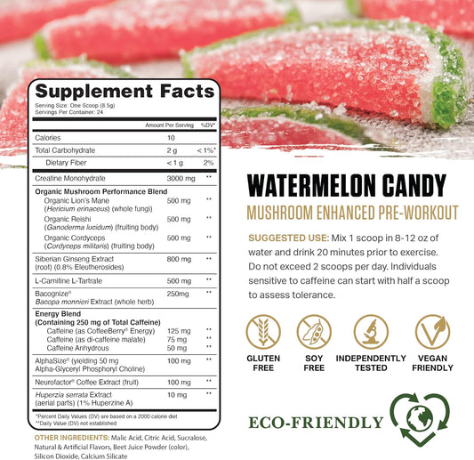 Ambrosia Kinetic Organic Preworkout with Mushroom Enhanced Nootropic Superfood Powder for Energy - Watermelon Candy Flavor