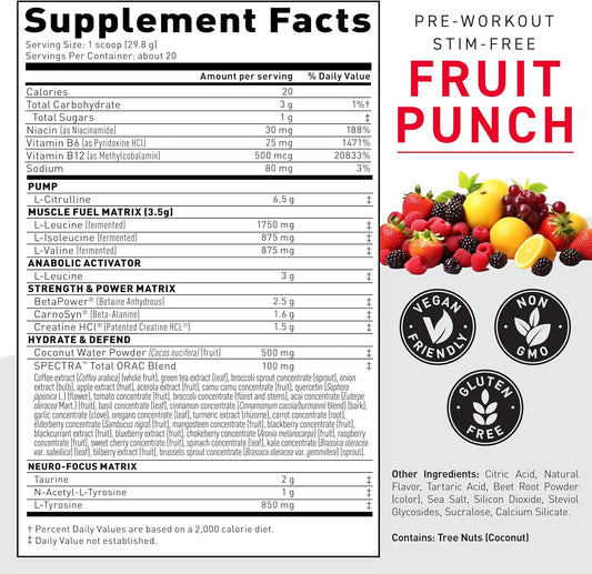 Fruit Punch Pre-Kaged Stimulant-Free Pre Workout Powder with Creatine & Beta Alanine - No Jitters - 20 Servings