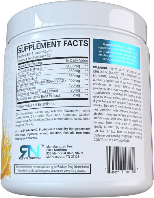 RUCK NUTRITION Rage Pre-Workout Supplement - 30 Servings for Energy Boost and Pump Enhancement with Citrulline, Caffeine, and Green Tea Leaf - Orange Burst Flavor