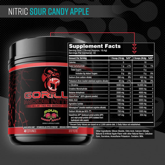 Gorilla Mind Nitric 1.0: Stimulant-Free Pre-Workout for Massive Pumps - Sour Candy Apple Flavor - 776g