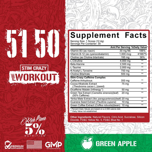 5% Nutrition Rich Piana 5150 High Stim Pre-Workout Powder - Extreme Energy Boost with Focus, Pumps, and Endurance - Green Apple Flavor - 30 Servings