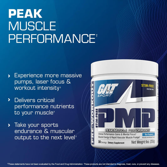 GAT SPORT PMP Pre-Workout Supplement, Blue Raspberry Flavor, 30 Servings - Stimulant-Free Formula for Peak Muscle Performance