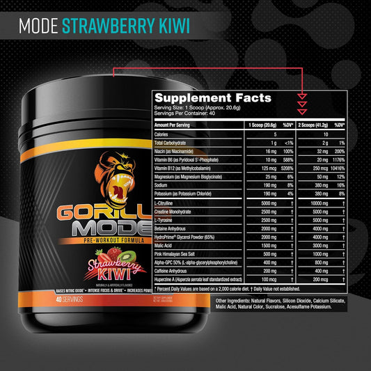 Gorilla Mind Pre Workout Supplement for Energy, Focus, and Muscle Pumps - L-Citrulline, Creatine, L-Tyrosine, Betaine, Alpha-GPC, Caffeine - 816g Strawberry Kiwi Flavor