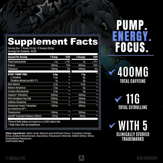 RYSE Noel Deyzel x Godzilla Pre Workout Supplement - Intense Energy, Pumps, & Focus - Citrulline, Beta Alanine, 400mg Caffeine - 40 Servings (Blue Raspberry)