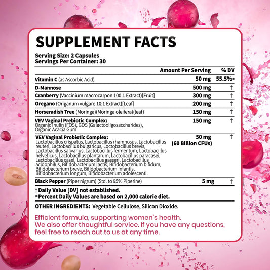VEV Women's Vaginal Probiotics with Prebiotics & D-Mannose - 60B CFUs, 19 Strains, Cranberry & Moringa - Feminine Health Support - Vegan - 60-Day SupplyVendor:VEVRegular price $101.35 AUDRegular priceUnit price / per-
