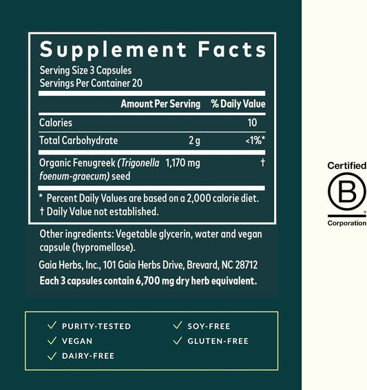 Organic Fenugreek Seed Capsules for Breast Milk Production Support - 60 Vegan Liquid Phyto-Capsules - 15-Day Supply