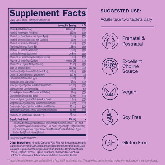 Prenatal Multivitamin with Methylfolate & Choline - 60 Vegan Tablets - Supports Healthy Mom & Baby - Gluten & Soy Free - 30 Servings