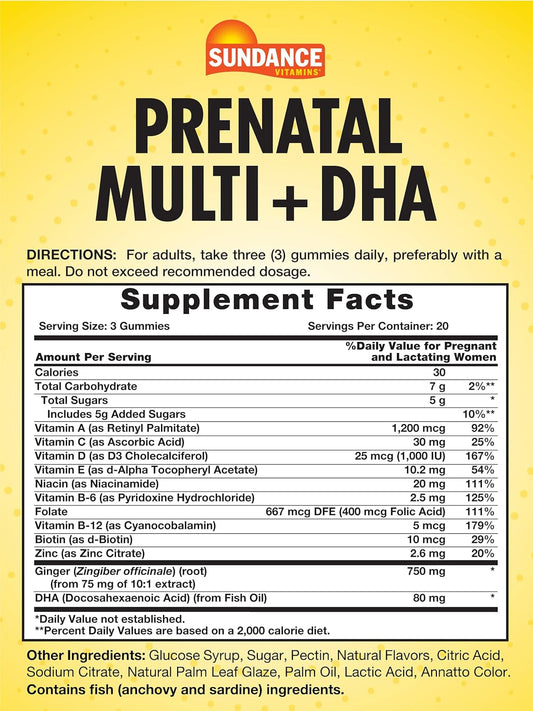 Sundance Prenatal Multivitamin Gummies with DHA & Folate - 60 Count - Fruit Flavor - Non-GMO and Gluten Free - Before, During, After Pregnancy