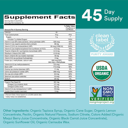 Organic Prenatal Multivitamin Gummies with Omega 3, Biotin, Methylfolate, and Zinc - 180 Count