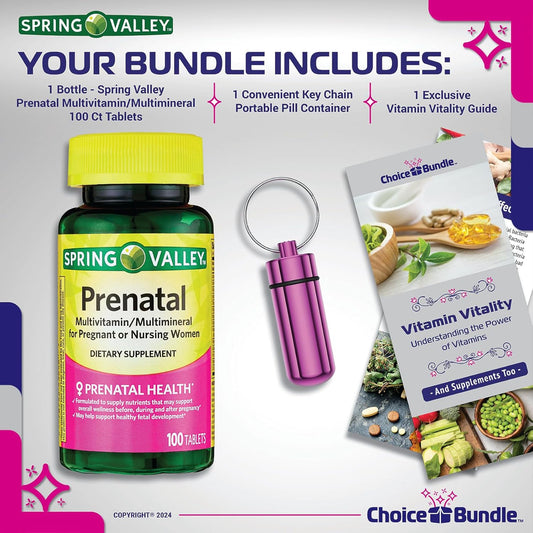 Prenatal Multivitamin Multimineral Tablets Bundle for Pregnant & Nursing Women - 100 Ct + Vitamin Guide & Pill Container