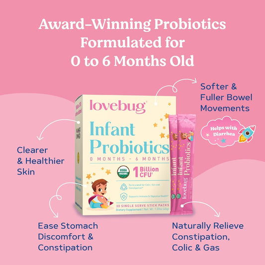 USDA Organic Lovebug Infant Probiotics 0-6 Months - Baby Gas, Colic, Reflux Relief - Allergen & Sugar Free, 30 Pack