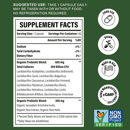 High Potency Probiotic Supplement for Digestive & Immune Health - 200 Billion CFU, 12 Strains, Organic Prebiotics, 180 Capsules