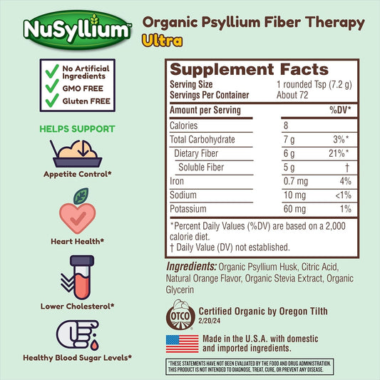 Organic NuSyllium Ultra Psyllium Husk Powder - 10.7 Oz, Sugar-Free Fiber Supplement for Digestive Health - Orange Flavor, 42 Servings