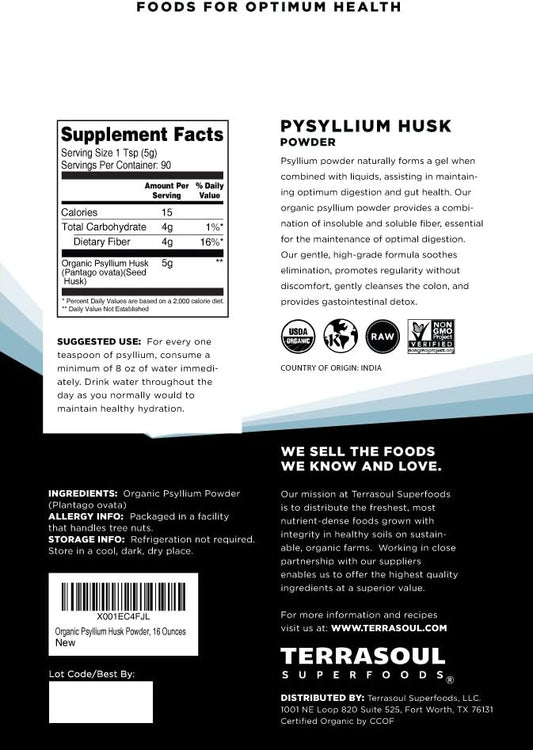 Terrasoul Superfoods Organic Psyllium Husk Powder - 1 Lb | Superfine Texture for Keto Baking | High Purity Fibre Supplement