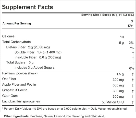Gentle Lemon-Lime Fiber Powder with Psyllium Husk, Oat, Apple, Grapefruit, Guar Gum, Probiotics - 60 Servings, Natural Soluble/Insoluble Fiber for Regularity and Cleansing