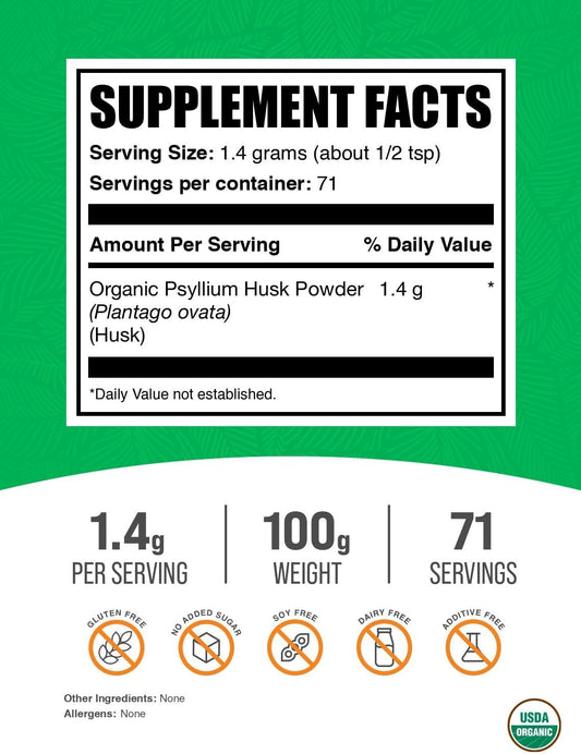 Organic Psyllium Husk Powder - Gluten Free Fiber Supplement for Baking, 1400mg per Serving, 100g