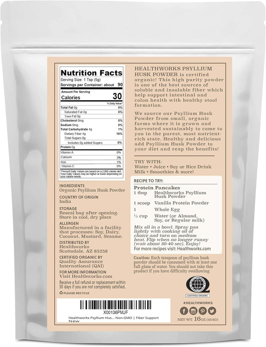 Raw Certified Organic Psyllium Husk Powder - 16 Ounces from India | Keto, Vegan & Non-GMO | Fiber Support Supplement