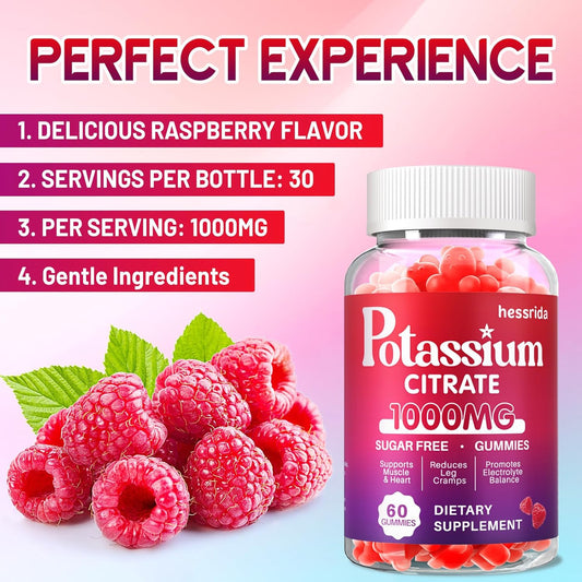 1000mg Potassium Citrate Gummy Supplement for Adults - Supports Heart & Muscle Health, Electrolyte Balance, Reduces Leg Cramps - Raspberry Flavor - 60 Count