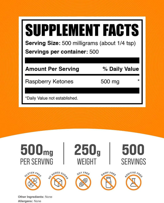 BulkSupplements.com Raspberry Ketones Powder - Antioxidant Source for Energy Support - Gluten Free, 500mg per Serving - 250g (8.8 oz) Pack