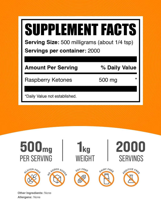 BulkSupplements.com Raspberry Ketones Powder - High Quality Antioxidant Source for Energy Support - Gluten Free, 500mg per Serving, 1kg (2.2 lbs)