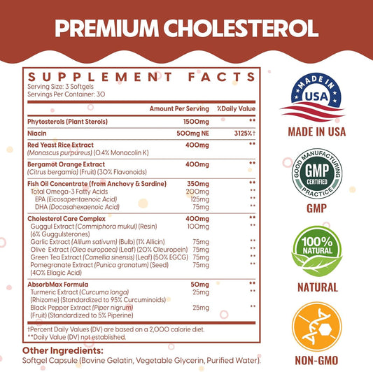 180 Softgels ChiQwench Cholesterol Supplements with Plant Sterols, Niacin, Red Yeast Rice, Citrus Bergamot, and Garlic for Maintaining Healthy Cholesterol Levels