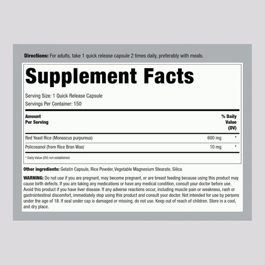 Red Yeast Rice Capsules - 600mg with Policosanol | Non-GMO & Gluten Free Supplement | 150 Count