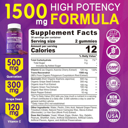 Premium Sugar-Free Resveratrol Gummies 1500mg with Quercetin, Grape Seed, Acai - Antioxidant Support for Healthy Aging, Skin, Joints, Brain - 2PackVendor:NextdiaRegular price $151.69 AUDRegular priceUnit price / per-