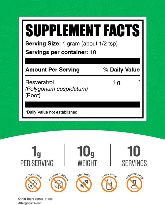 Resveratrol Powder Supplement - 1000mg per Serving, Antioxidant Rich Polygonum Cuspidatum Extract - Gluten Free, 10g (0.35 oz) Pack of 1