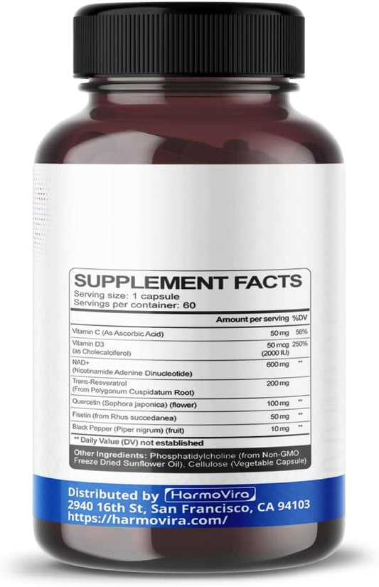 120-day Supply of HarmoVira NAD+ RESVERATROL Quercetin Fisetin Black Pepper - USA Made Healthy Aging & Energy Support Supplement