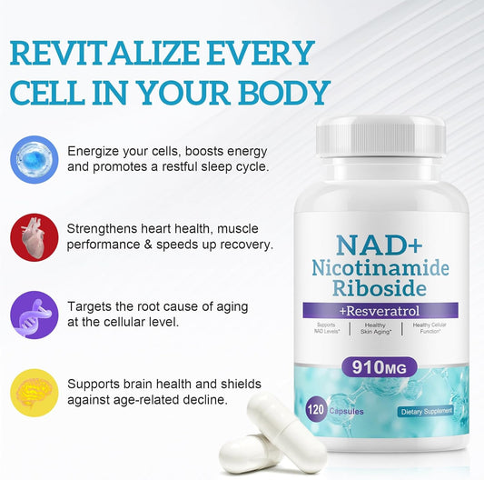 Liposomal NAD+ Supplement with Resveratrol 910mg - Supports Muscle, Brain, Energy - 120 Capsules for Men and Women