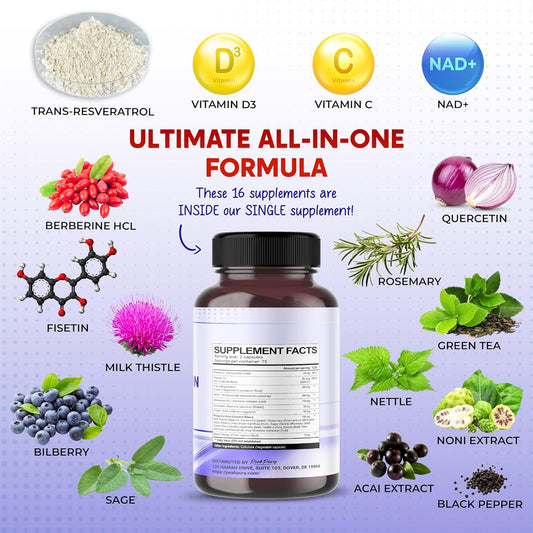 USA-Made PeakPury NAD+ Trans-Resveratrol Berberine Quercetin Fisetin Milk Thistle Supplement