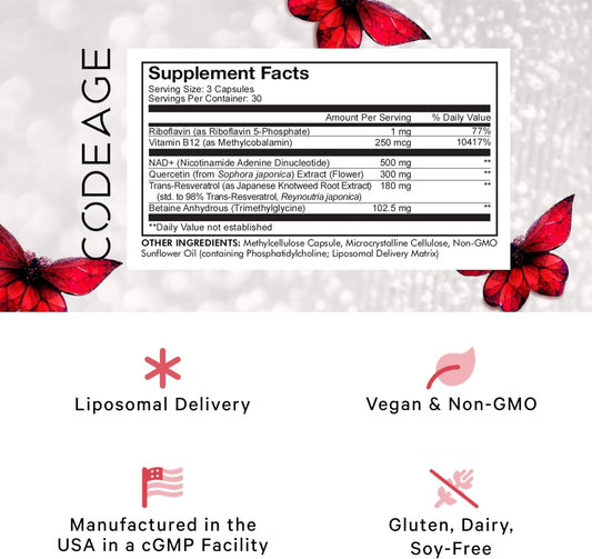 Bioavailable Liposomal NAD+ with Resveratrol & Vitamin B - Energy & Aging Support - NAD Supplement with Quercetin, Betaine, Riboflavin - 90 Capsules
