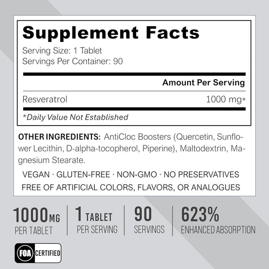 High Potency AntiCloc Premium Resveratrol Tablets - 90 Day Supply | 1000MG | 98% Purity | Enhanced Absorption | Supports SIRT1 and AMPK | Promotes Autophagy | Anti-Aging Formula